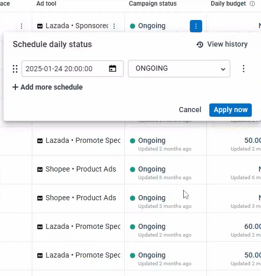 - Functionality: Automates changes to campaign statuses (Active or Paused) at predefined times.
